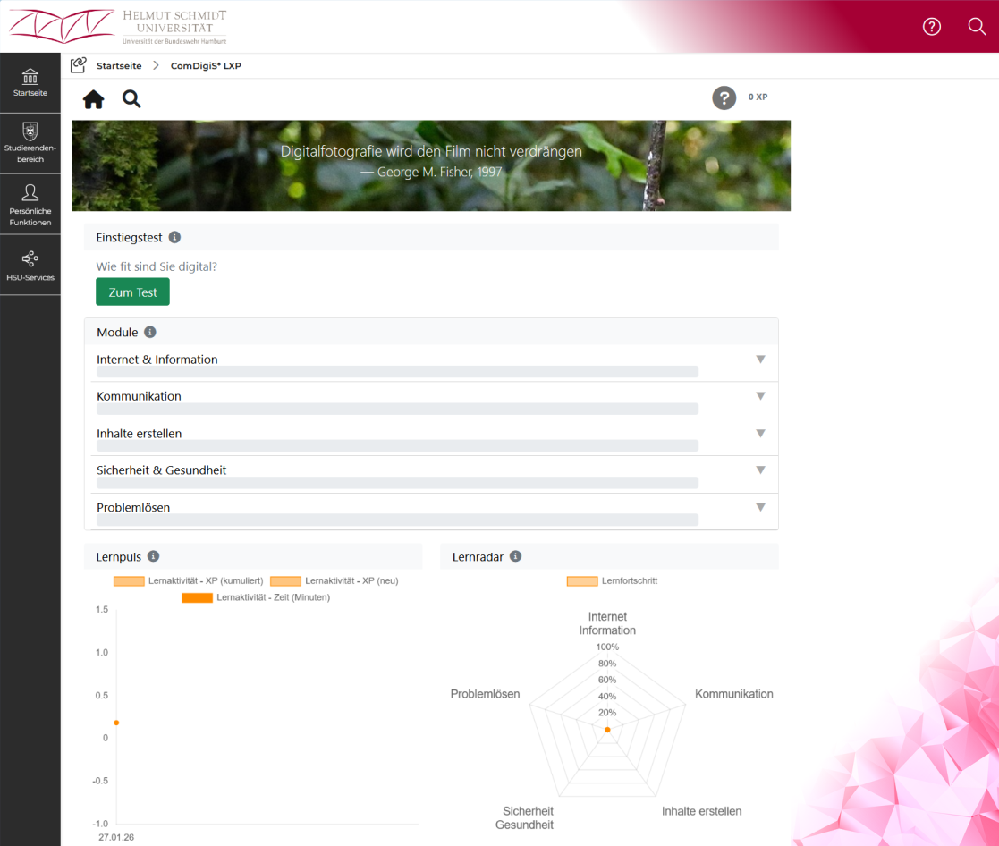 Die Lerneinheiten sind in Lernkomponenten unterteilt. Ein Einstiegstest ermittelt dein Vorwissen – Vorkenntnisse sind nicht erforderlich. Der Abschlusstest zeigt, wie weit Du gekommen bist. Der sogenannte Lernpuls misst Deine Aktivität, das Lernradar visualisiert Deinen Fortschritt entlang der Module und Lernpfade.